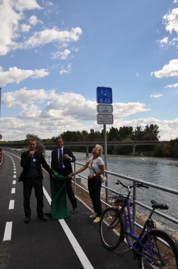Slovesno razkritje table na Dravski kolesarski poti. Josip Rotar (SKM), Samo Peter Medved (DCM) in mag. Polona Andrejčič Mušič (DRSC).